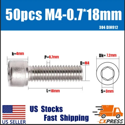 50PCS New M4X 18mm 304 Stainless Steel Allen Hex Socket Cap Head Screws DIN912