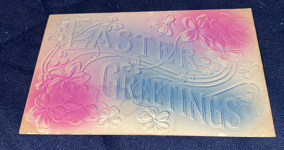 Easter Greetings Vintage Postcard Flowers Egg Ribbon Chick Embossed 1910 Purple