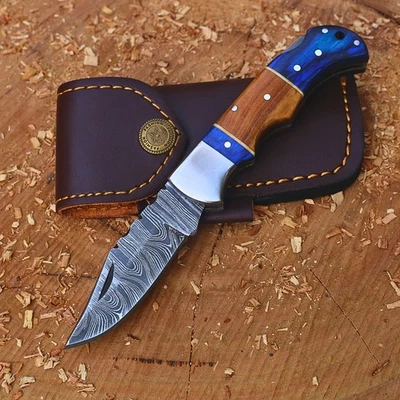 Premium Damascus Folding Knife (3" blade) with Pakkawood Handle & Leather Cover