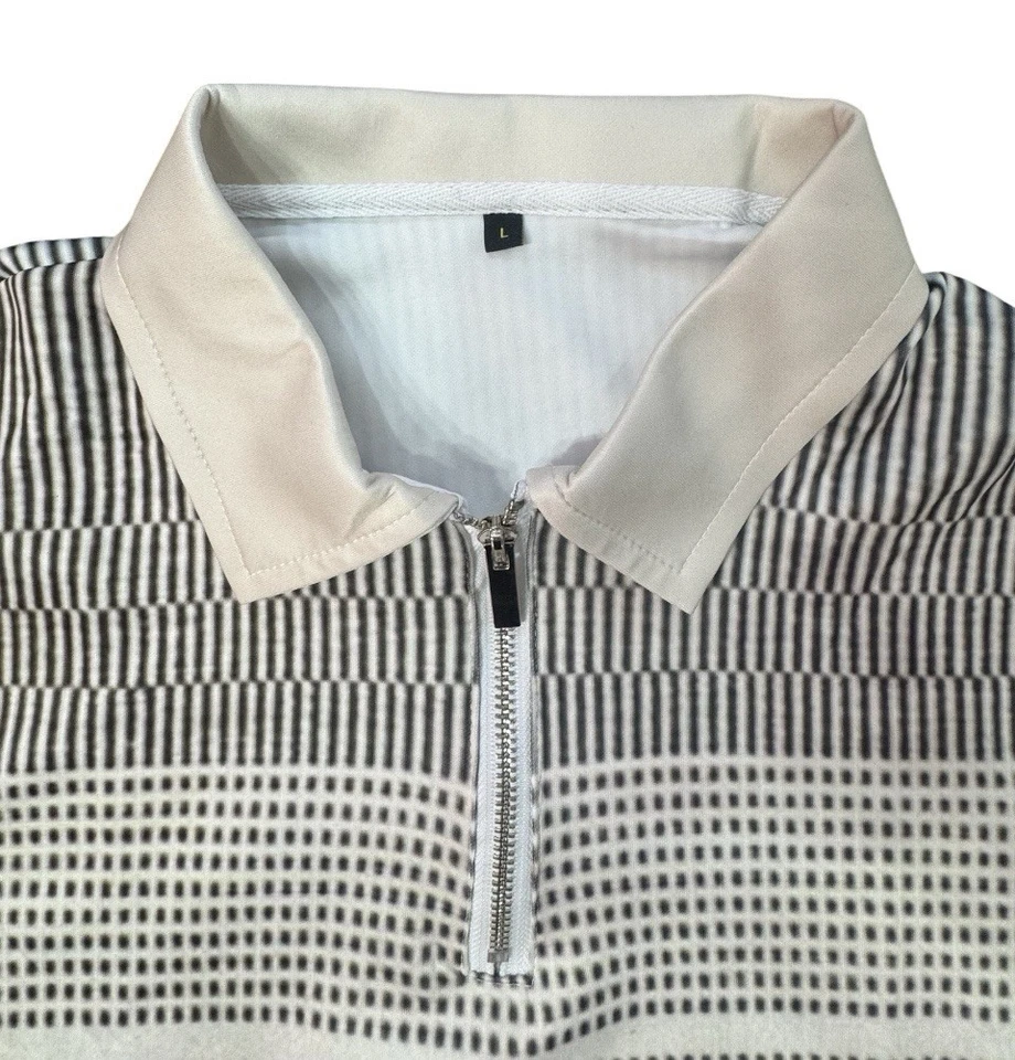 Men's Beige Striped Long Sleeve 1/4 Zip Golf Polo Shirt Size L