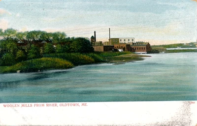 WOOLEN MILLS FROM RIVER, OLDTOWN, ME. MAINE. FACTORIES/MILLS. SMOKESTACKS. UDB.