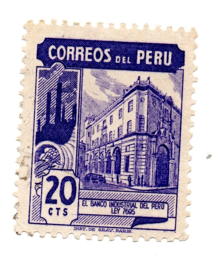 Buildings: Industrial Bank, purple, 20 cents, Perú 1949
