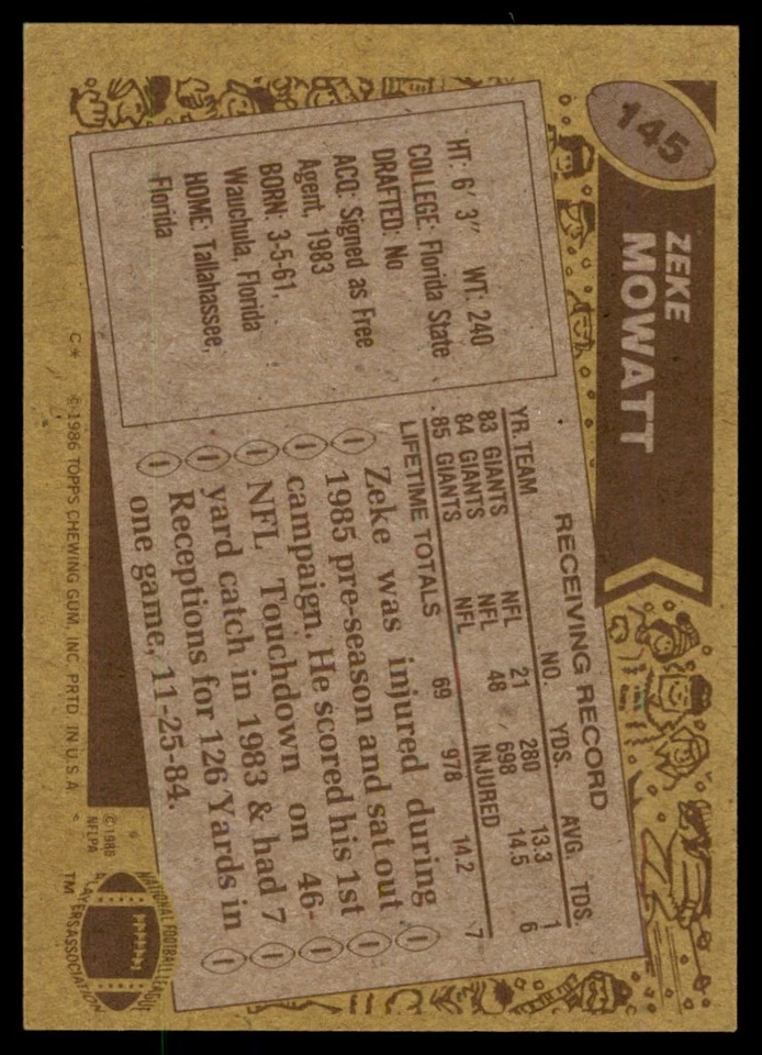 Zeke Mowatt 1986 Topps #145 New York Giants NFL READ FREE SHIPPING AutographDen