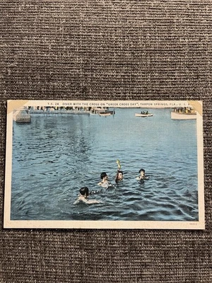 Linen Postcard Tarpon Springs, FL~Diver With Cross On “Greek Cross Day”