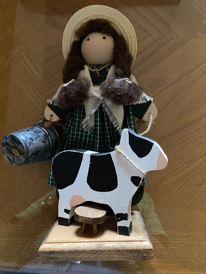 Vintage 12 Inch Woman/Girl Perhaps Amish Milking Cow Scene On Wood Stand