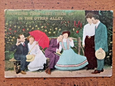 DB ROMANCE HUMOR POSTCARD "BOWLING TERM-SET THEM UP...", 1910