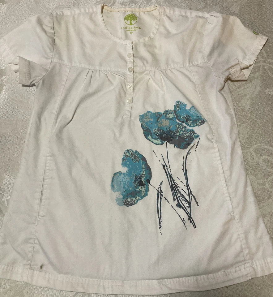 Healing Hands Scrub Top Women’s XS white with blue flowers