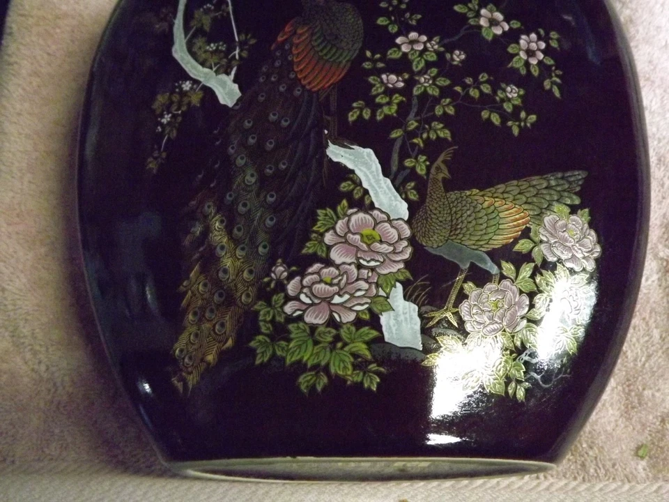 lg brown vase with peacocks painted on it Yamaji Japan 9 inches tall