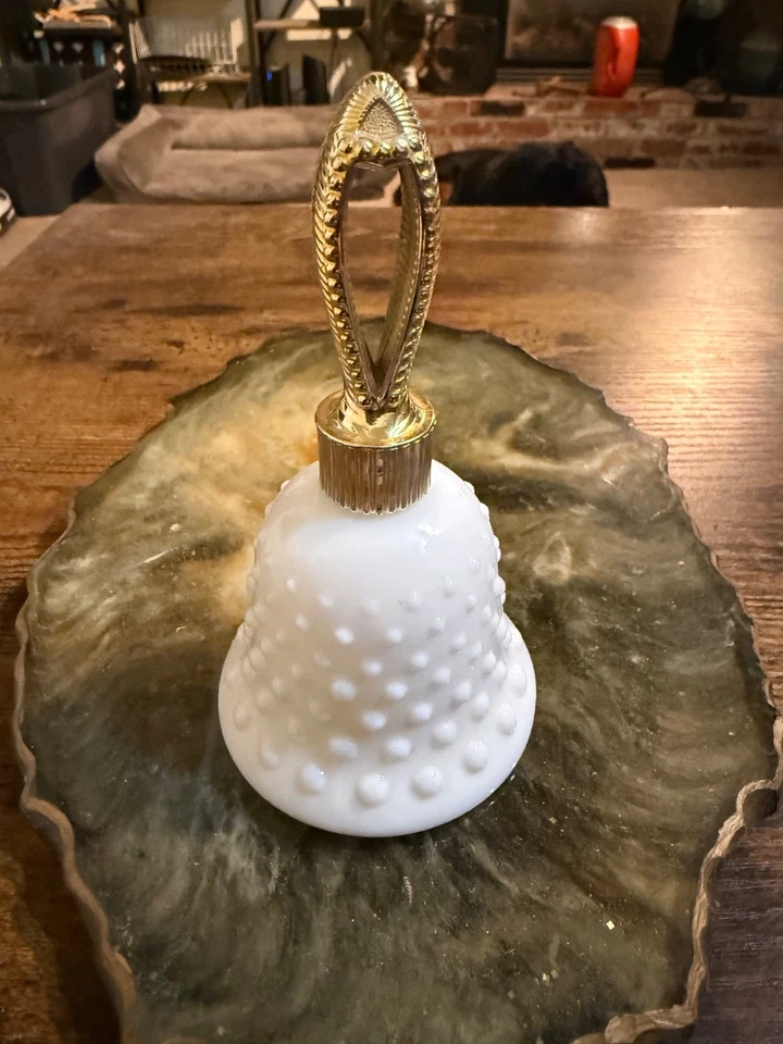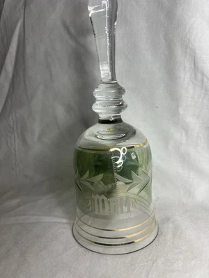 Vintage Yugoslavian Etched MOM Art Glass Bell Green With Gold Trim 6” tall