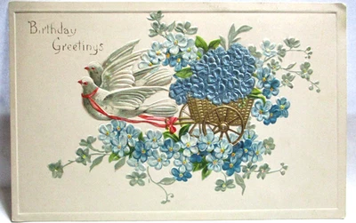 1910 POSTCARD BIRTHDAY GREETING, DOVES PULLING GOLD CART W/SATIN FORGET-ME-NOTS