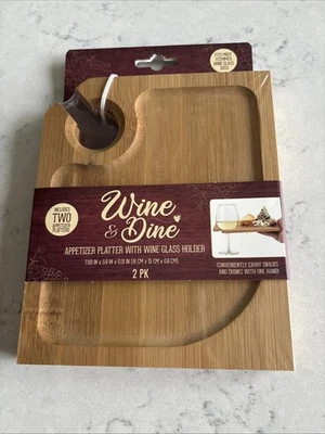 Wine & Dine Appetizer Platter with Wine Glass Holder Bamboo 2 Pack New Sealed