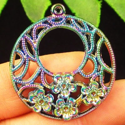 Rainbow Tibetan Silver Flower Round Pendant Bead 34x3mm H03780