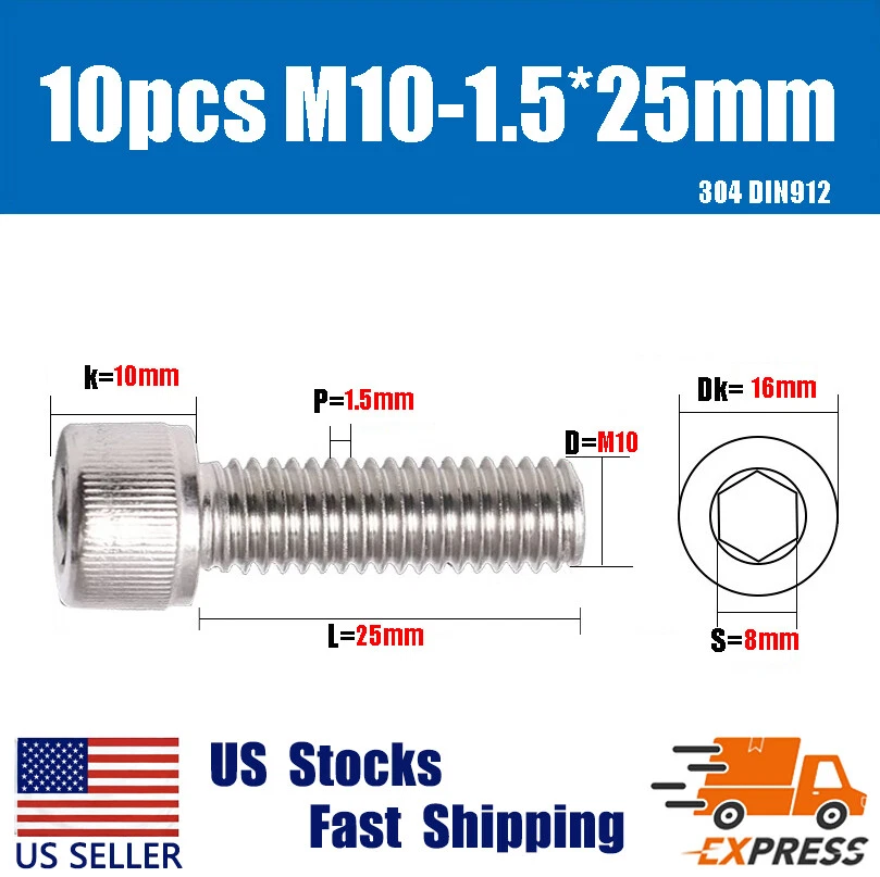 10PCS New M10 X 25mm 304 Stainless Steel Allen Hex Socket Cap Head Screws DIN912