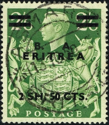 SG E23 BRITISH OCCUPATION (ERITREA) 1950 – 2s 50c on 2/6d YELLOW-GREEN – USED