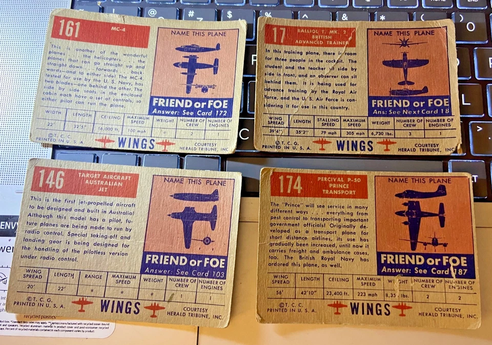 4 Topps Wings Friend Or Foe Trading Cards Military Aviation Cards 1950’s
