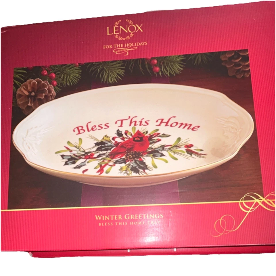 Lenox Winter Greetings Bless This Home Porcelain Oval Tray Cardinal Pine Boxed