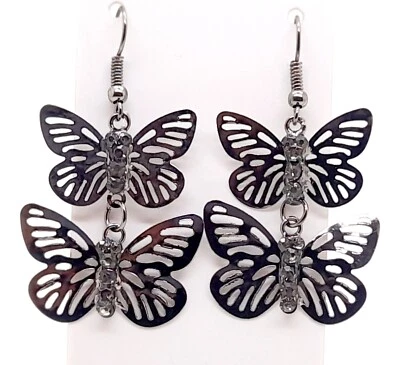 black Metallic butterfly with rhinestones French hook drop fashion Earrings #3