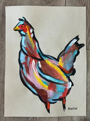 Atherton 9x12 Original Expressionism Acrylic Painting "BARNYARD CHICKEN" signed