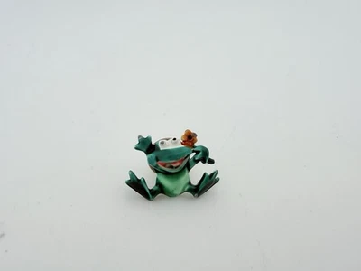 VTG. GREEN & WHITE ENAMEL SMILING/JUMPING GOLD TONE FROG PIN 527