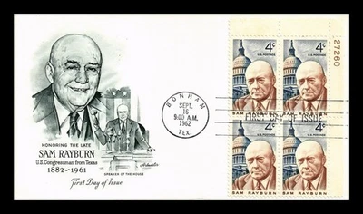 US COVER SAM RAYBURN FDC SCOTT 1202 PLATE BLOCK ARTMASTER CACHET