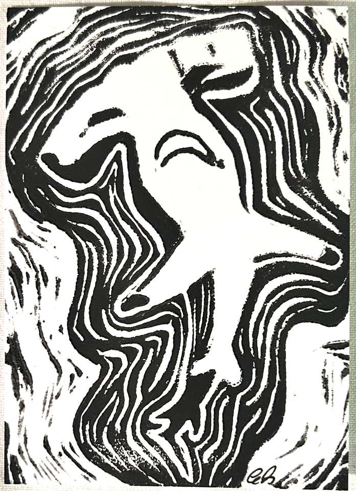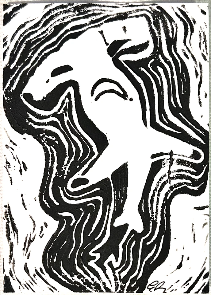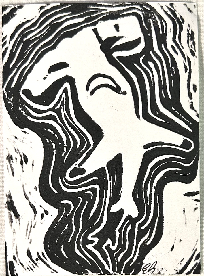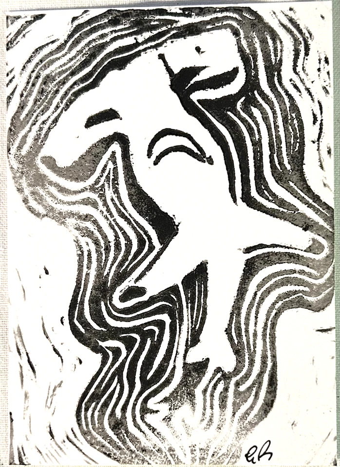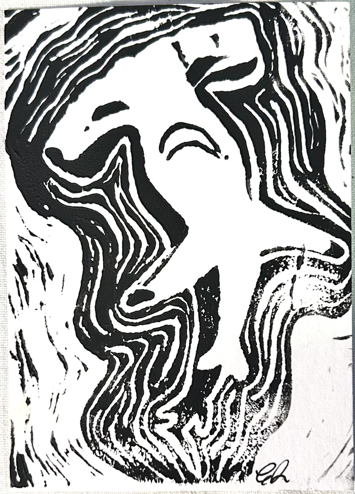 aceo original art, mini lino cut, shark, hammerhead print 11/16, 3.5x2.5