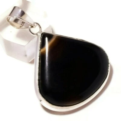 Black Agate Hand Polished Pear Gemstone Silver Overlay Handmade Pendant A3638