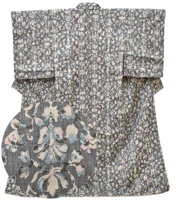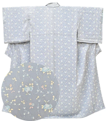 JAPANESE KIMONO VINTAGE JACKET ROBE KOMON FLOWER GRAY BLUE 3mt1037P