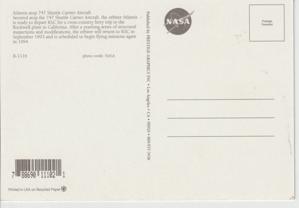 ATLANTIS ATOP 747 SHUTTLE CARRIER AIRCRAFT, 1993 VINTAGE B-1116 NEW POSTCARD