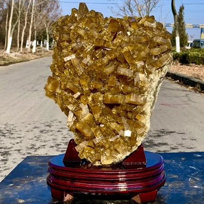 16.14LBShiny Golden Cuboid Barite Crystal Based on the Purple Spherical Fluorite