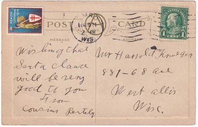 Scott 552 on 1924 Postcard with OMRO, WIS, DEC 16TH CDS, WX32 Christmas Seal
