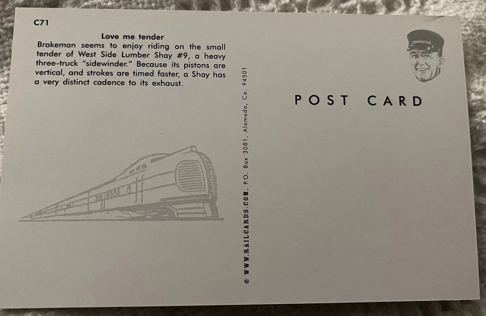 Love Me Tender West Side Lumber Shay #9 “sidewinder” Postcard Railroad Train