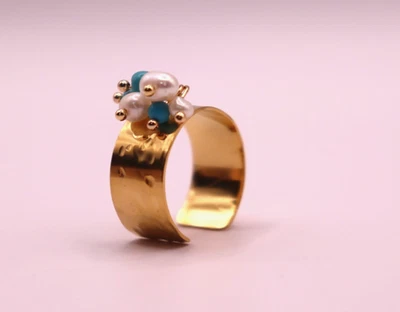 Gold Tone Open Cuff Ring with White & Turquoise Beads – Fashion Statement Ring