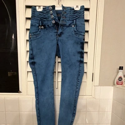 MX Jeans Women's High Rise Skinny Blue Denim Jeans Button Ruched Solid 5-Pocket