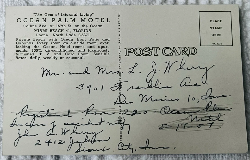 Miami Beach Florida FL Ocean Palm Motel 1957 Sensible Rates Postcard