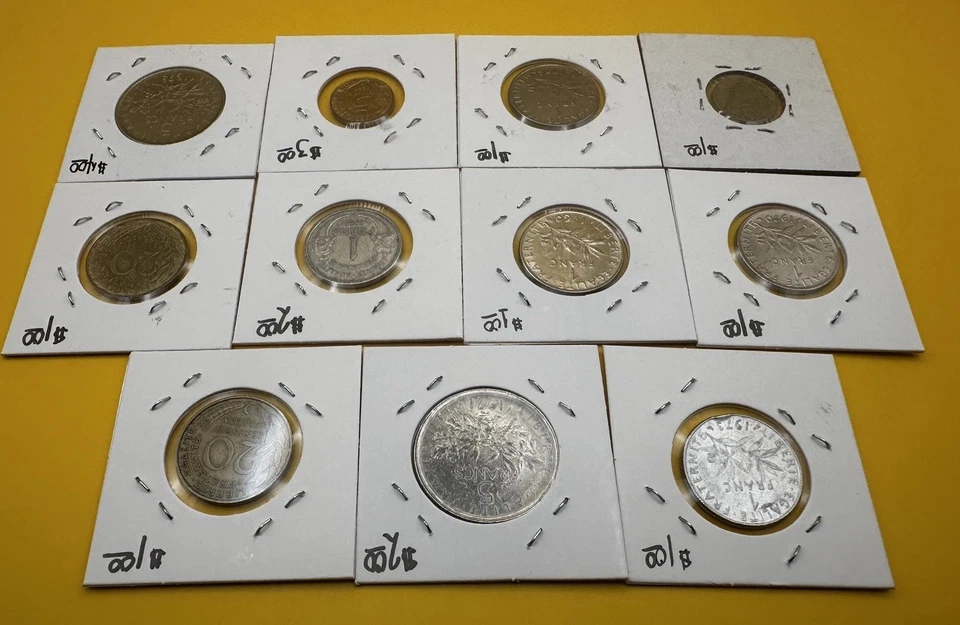 France Coin Lot (11) Mixed Dates & Denominations – 5 Francs, 1 Franc, Centimes