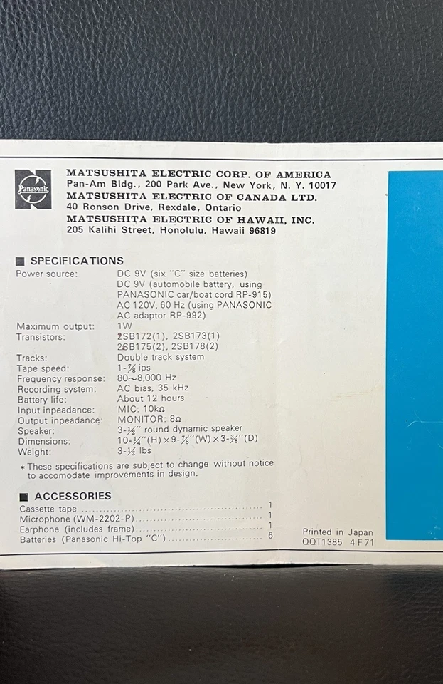 Operating Instruction Manual - Panasonic Cassette Tape Recorder - Model RQ-224S
