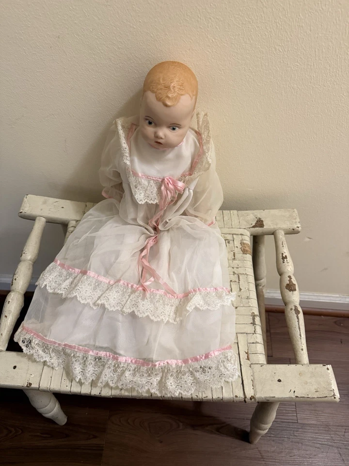 Beautiful baby baby Ceramic Doll In Long White Gown In Excel. Cond Approx 18”