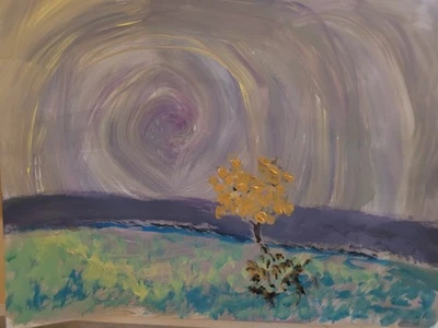 Whimsical 9x12 acrylic landscape with golden tree under swirling twilight sky.