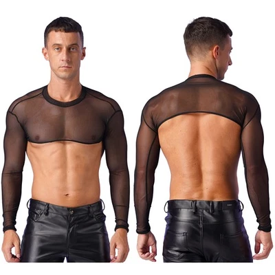 #M Mens Sheer Mesh Long Sleeve T-Shirt Stretch Slim Fit Half Crop Top Pullover
