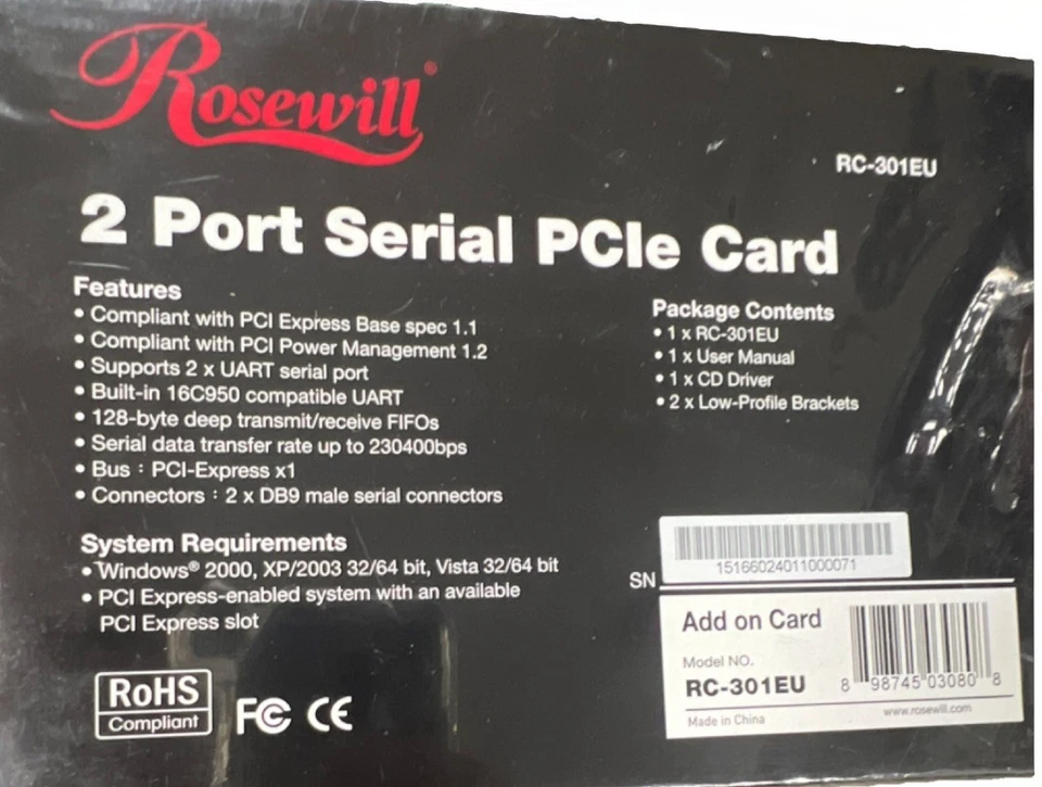 Rosewill RC-301EU 2-Port Serial PCIe Card RS-232 Wired 230400bps