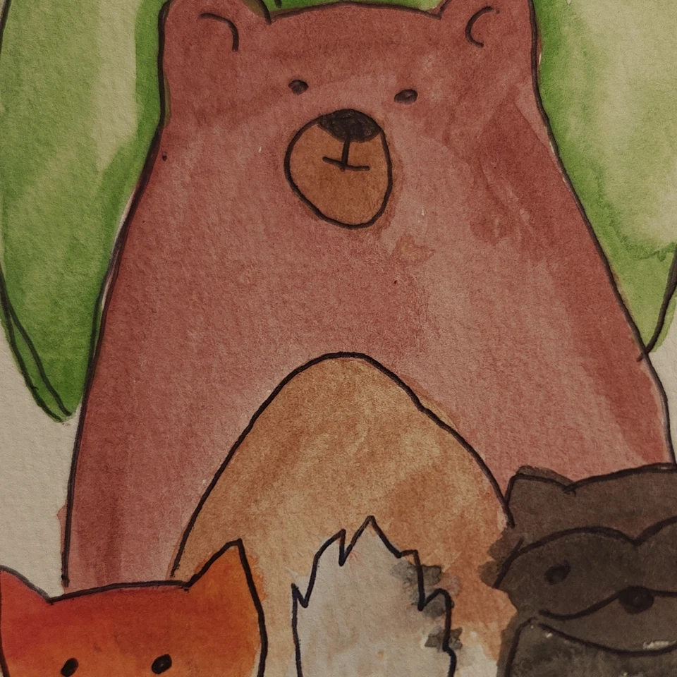 Bear Fox Raccoon Watercolor Illustration Art Postcard Drawing on Paper Small
