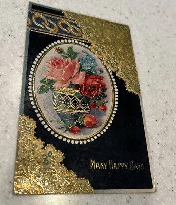 Many Happy Days Framed Red & Pink Roses~Embossed Vintage Postcard 1910 Horseshoe
