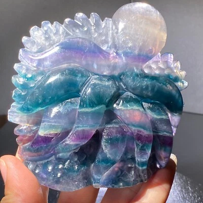 387g fluorite octopus Carved Quartz Crystal Skull Reiki Healing 1PC