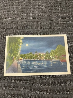 Linen Postcard Fort Lauderdale, Florida~ Moonlight and Palms along New River