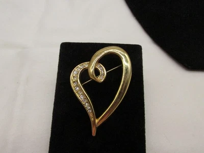 Vintage Gold Toned & Clear Rhinestone Heart Shaped Brooch 1.5 x 2.5" #78N