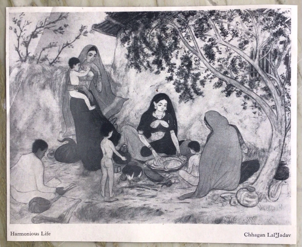 Vintage Modern Indian Art Print India Women Children Painting Bnw