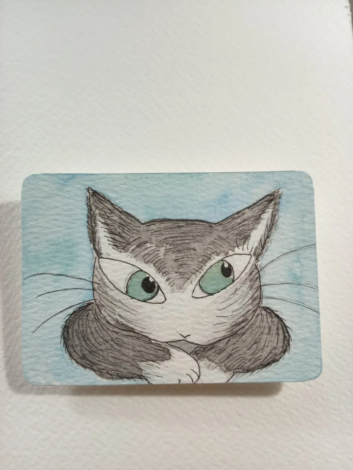 ACEO Art Card Original Watercolor Diaso cat -Eyes On You Cat