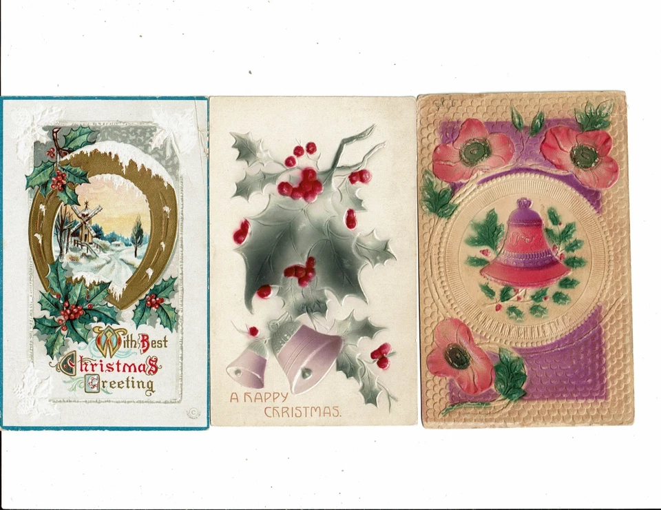 3 Card Lot, Christmas Holiday, Giant Horseshoe, Holly & Bells, 2 Embossed!