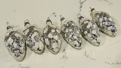 Lot of 6 Vintage Glass Flocked Silver Ornaments Vtg Shiny Snow Christmas Frosted