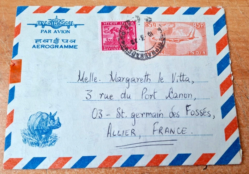 Air letter illustrated of a rhino INDIA to France 1972 nice stamps cancellations